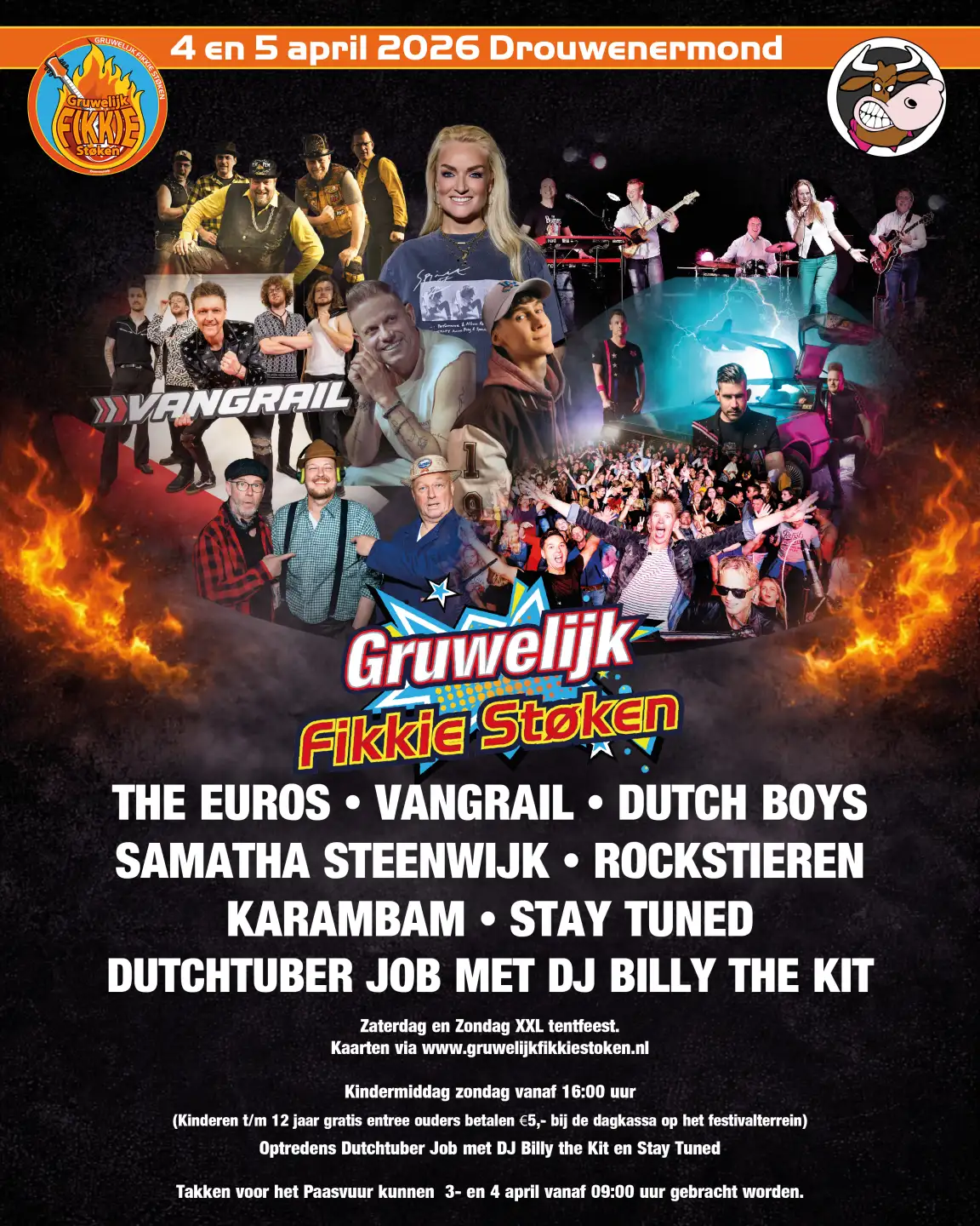 Gruwelijk Fikkie Stoken is hét XXL Paasweekendfeest waar iedereen samenkomt voor twee dagen vol live‑acts, DJ’s, kermisattracties, koude biertjes en natuurlijk dat herkenbare Boerenrock‑sausje. Verwacht een sfeer die warm is als het vuur, hard gaat als de muziek en vertrouwd voelt als thuiskomen.