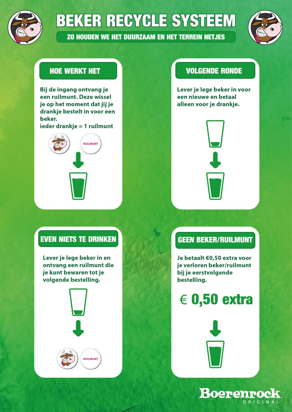 We hanteren een ruilsysteem voor de bekers, bij binnenkomst krijg je voor je eerste drankje een ruilmunt….daarna is het lege beker inleveren voor een drankje of een nieuwe ruilmunt. Geen beker of ruilmunt dan moeten we 0,50 cent extra vragen.